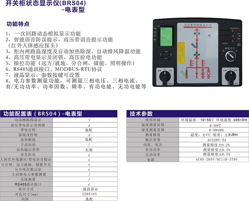 BRS04開關(guān)柜智能操顯裝置是針對目前中壓系統(tǒng)開關(guān)技術(shù)發(fā)展而開發(fā)設(shè)計的一種多功能智能化開關(guān)模擬綜合動態(tài)指示裝置,主要應(yīng)用于電壓等級為0.1~40.5KV的各種戶內(nèi)開關(guān)柜。 產(chǎn)品集中指示一次回路模擬狀態(tài)、手車位置、隔離刀位置、接地刀位置、開關(guān)狀態(tài)、操作機(jī)構(gòu)儲能狀態(tài);帶有高壓帶電指示、帶電閉鎖輸出、自動加熱除濕、實時數(shù)字顯示溫濕度值及加熱器故障監(jiān)測、超高溫報警并強(qiáng)制停止加熱、智能語音防誤提示、紅外人體感應(yīng)、電力參數(shù)測量、RS485通信接口等多種功能,簡化了開關(guān)柜面板設(shè)計,美化了部局,完善了開關(guān)狀態(tài)指示功能和安全性能的新型電氣裝置。目前該系列產(chǎn)品已廣泛地應(yīng)用于電力、化工、鐵路、礦山、冶金、水泥等諸多行業(yè)。